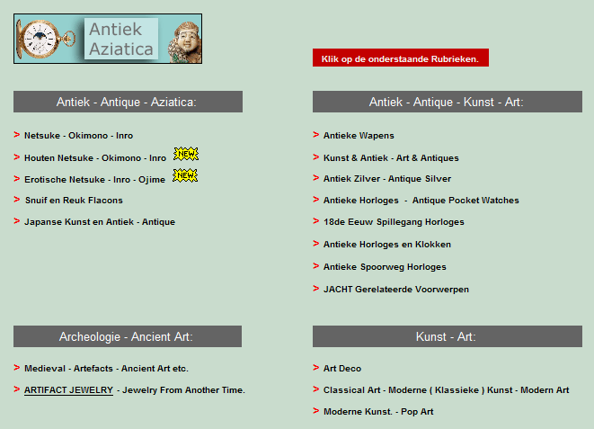Aziatische Kunst: Ivoor - Netsuke - Okimono - Inro - Ojime - Japanse Prenten - Porselein etc... Kunst en Antiek: Aardewerk - Porselein - Glas & Kristal - Zilver - Klokken - Horloges - Antieke Wapens etc...